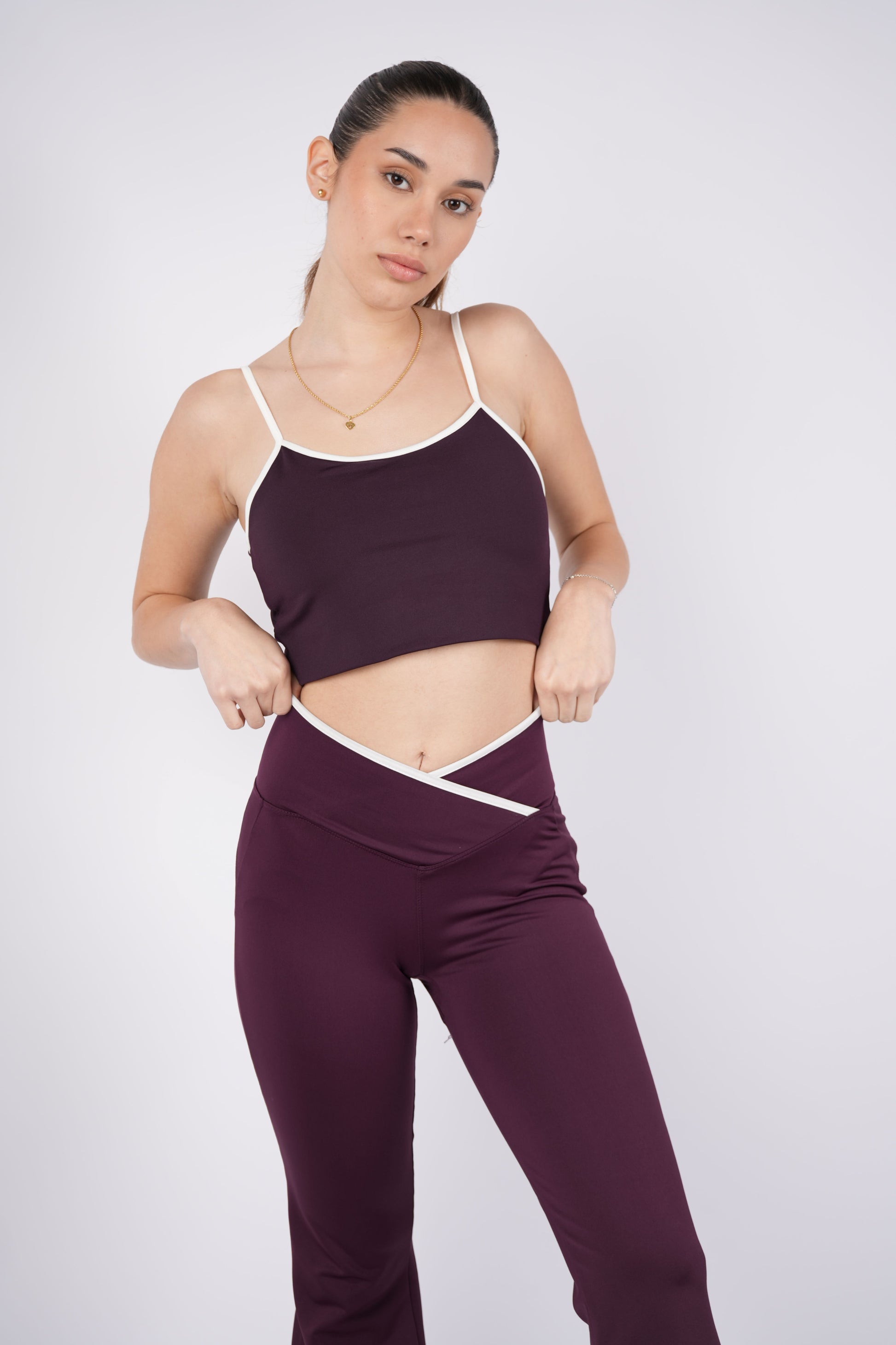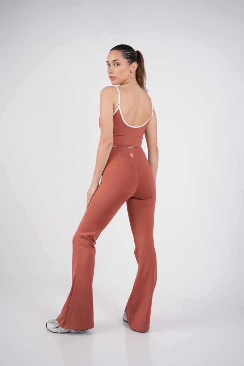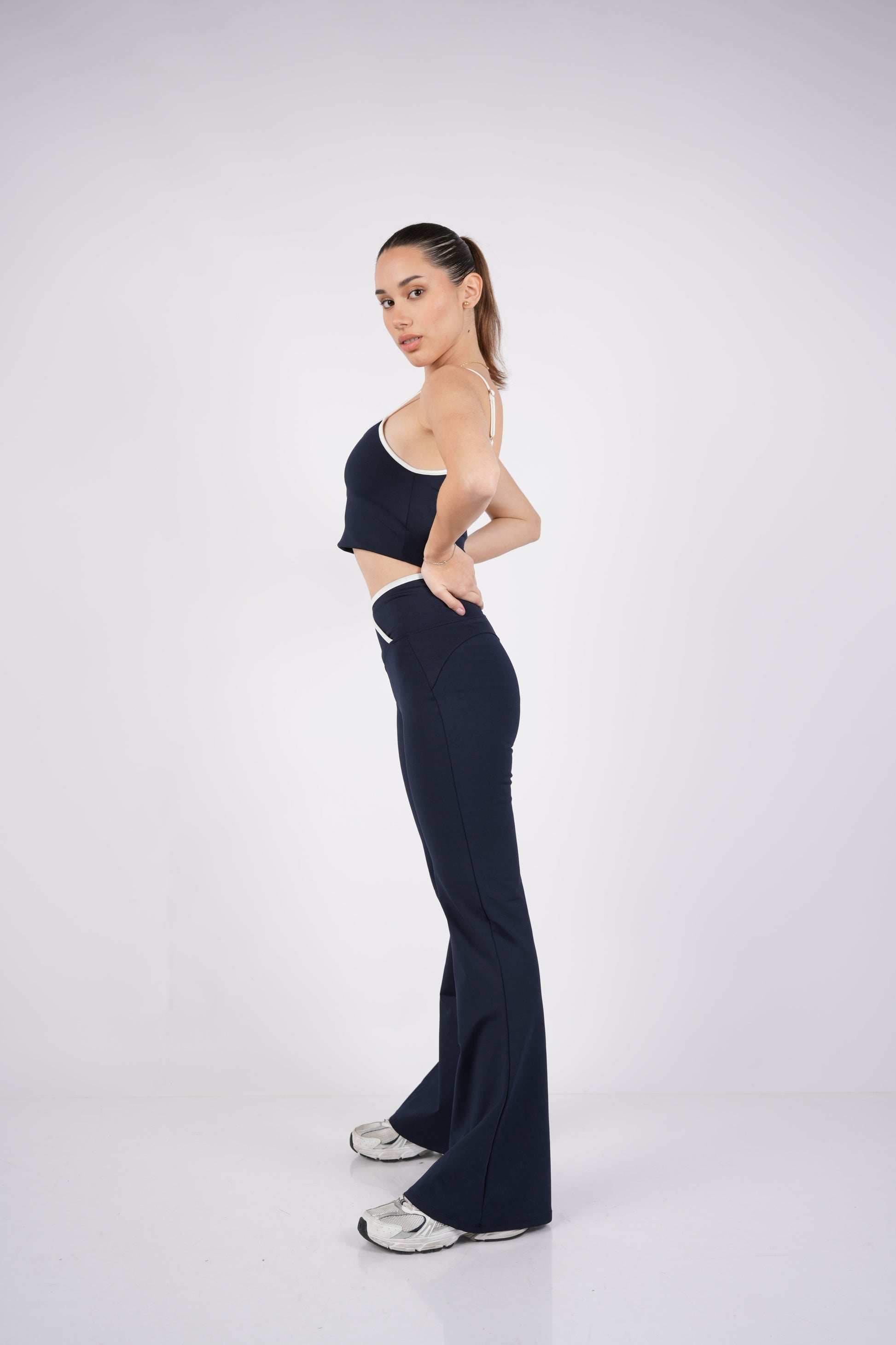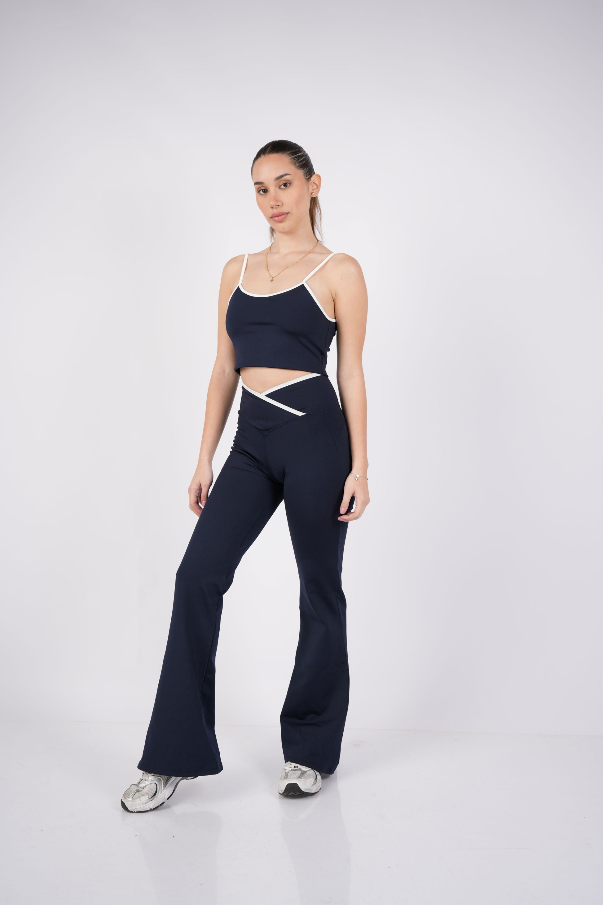 El pantalón flare con cintura cruzada que estiliza la figura y detalles en blanco que resaltan el diseño. Presenta un corte clásico en forma de corazón en la parte trasera para un mejor realce. Confeccionado en Suplex Colombiano de alta calidad.