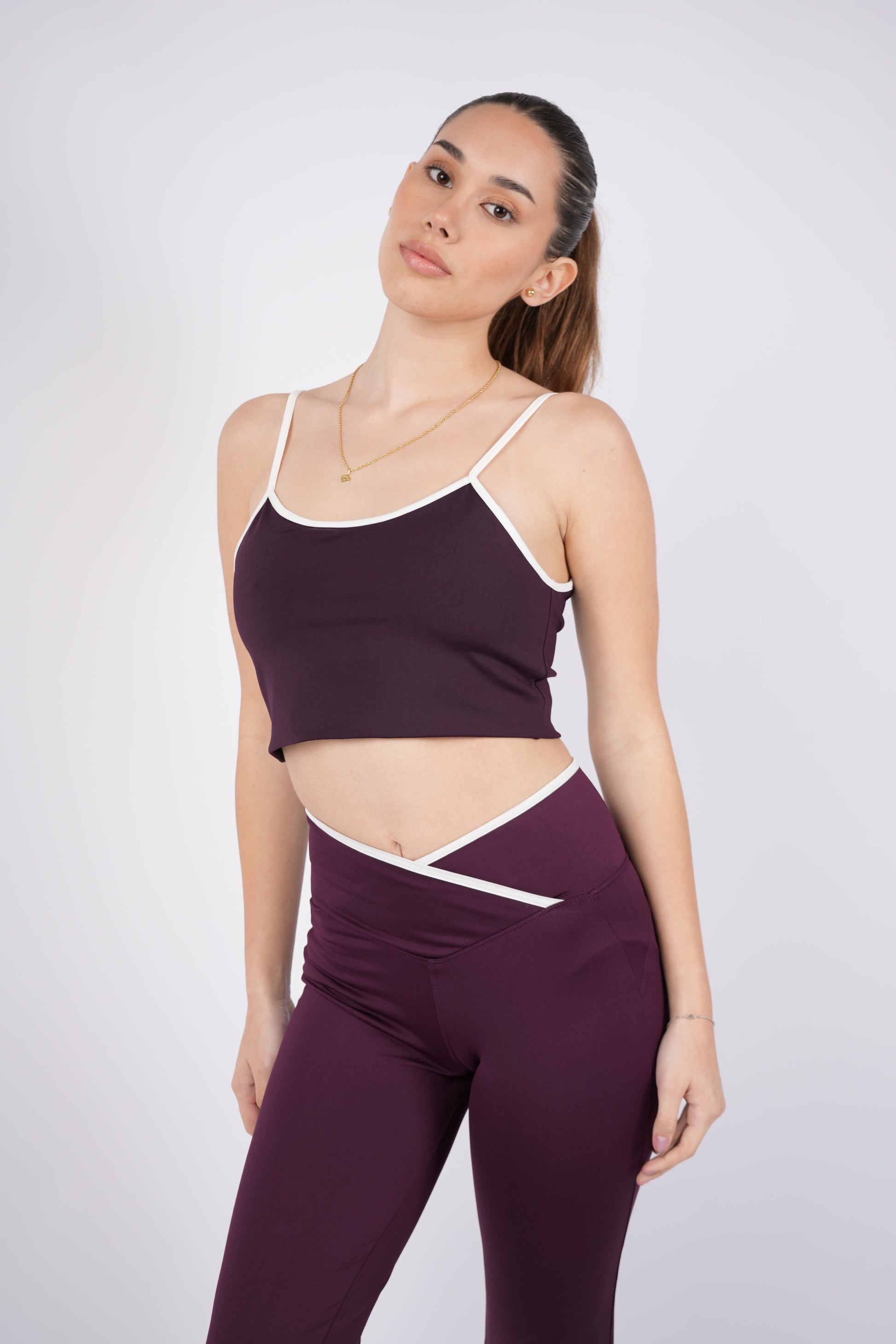 El top es con cuello redondo y espalda baja, hasta la cintura, tiene doble forro, cuenta con finas tiras blancas ajustables que crean un contraste elegante. Fabricado en suplex colombiano de alta calidad.
