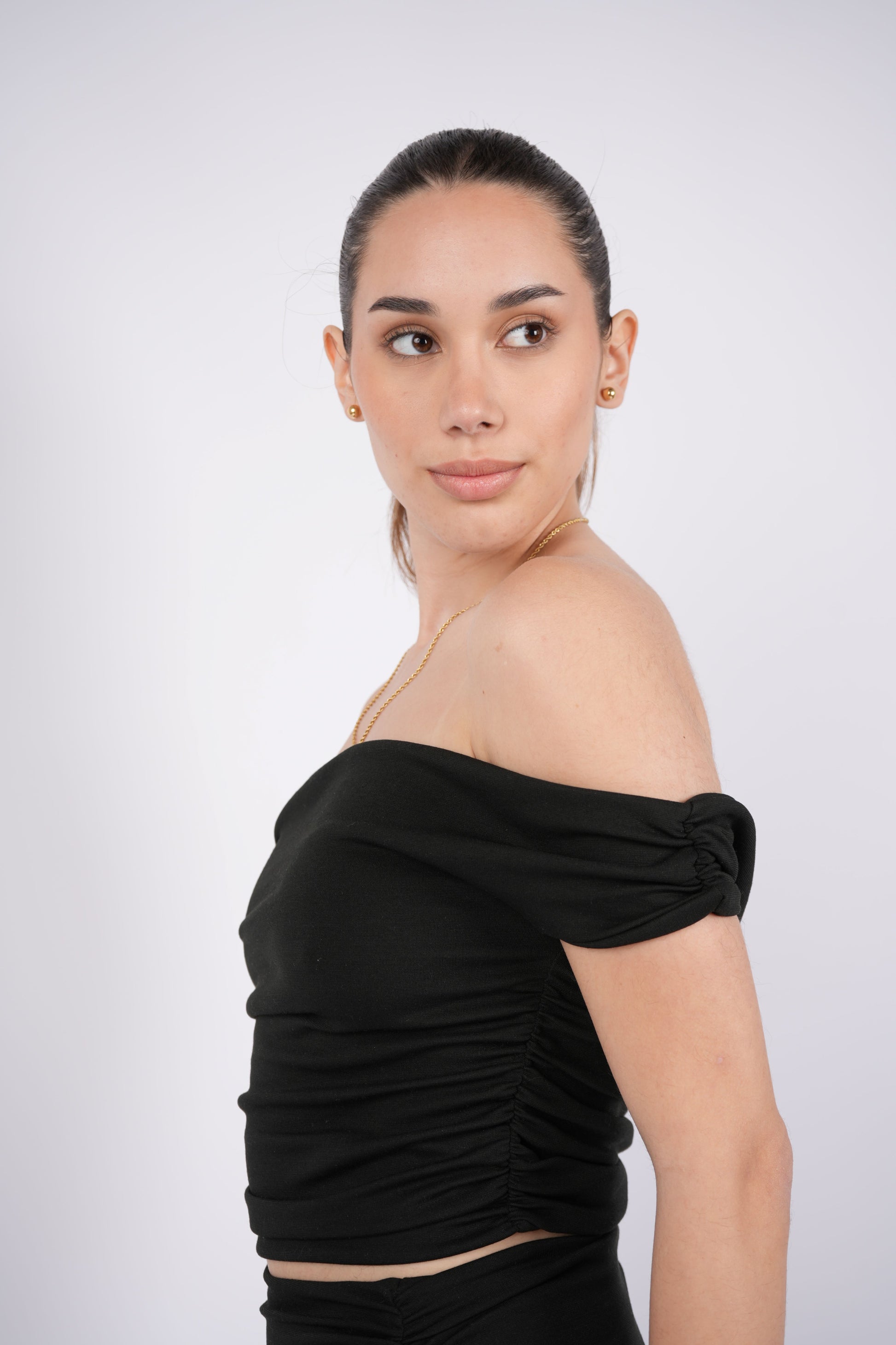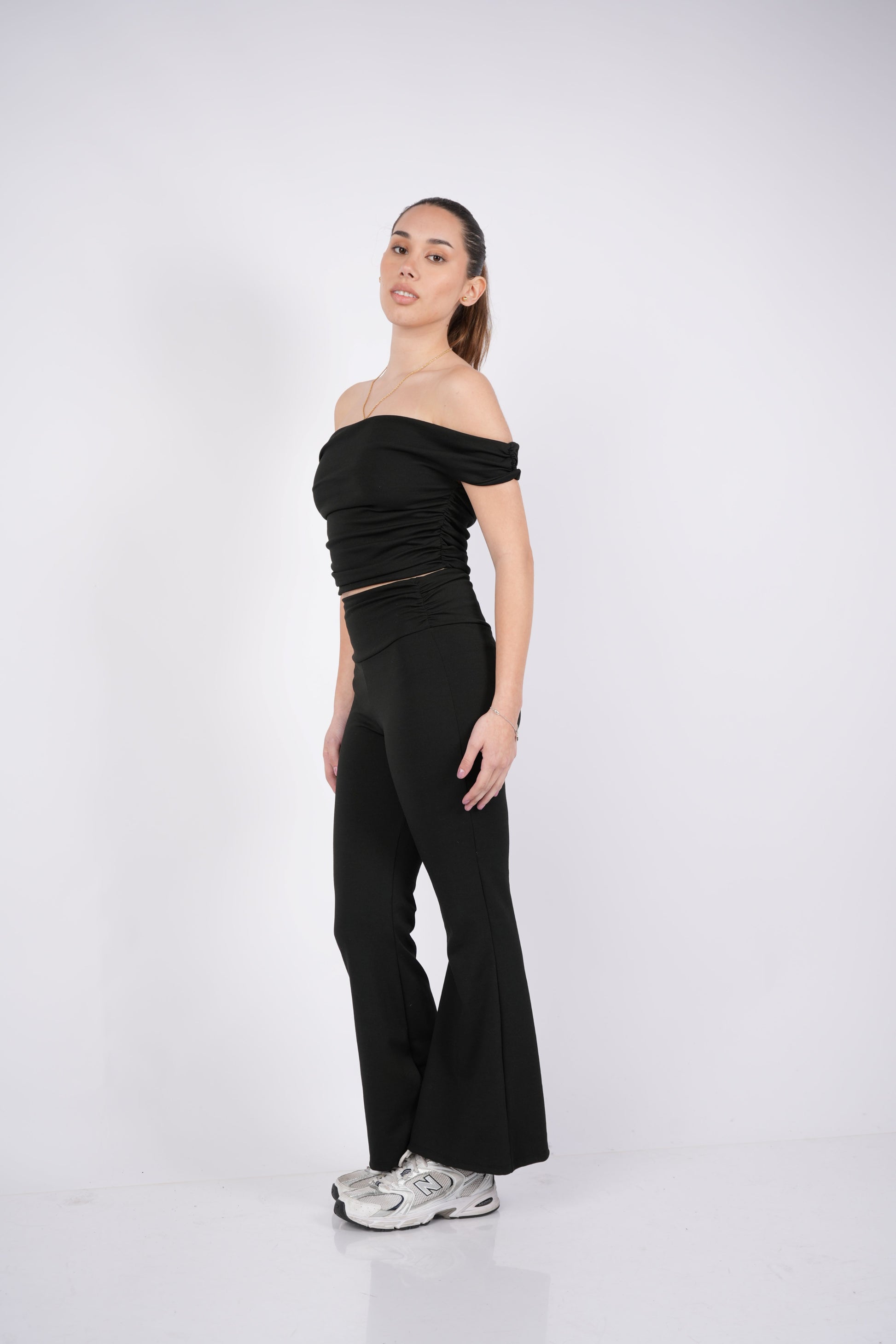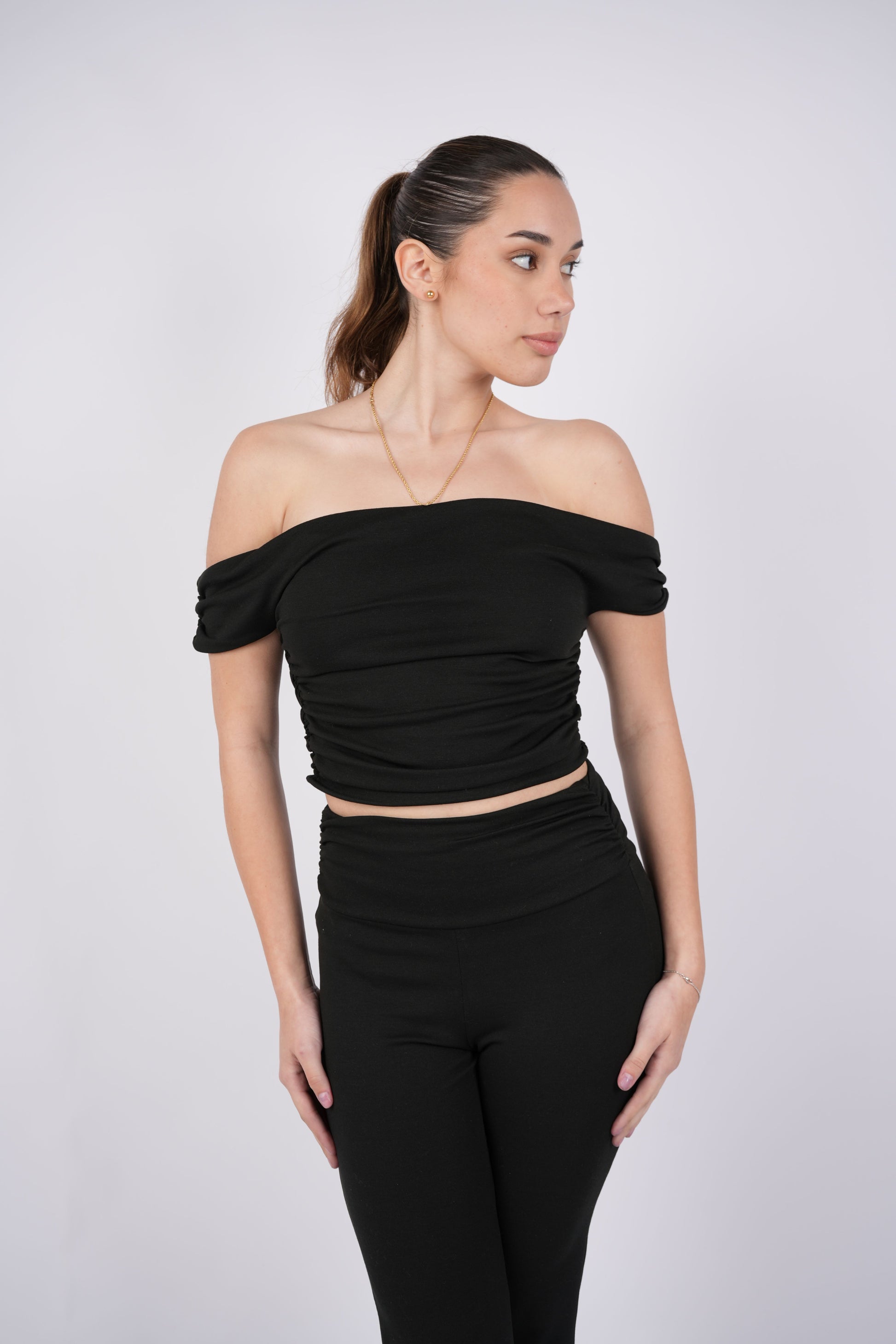 Este conjunto de yoga combina estilo y funcionalidad con sofisticación. La blusa presenta mangas caídas y escote barco que realzan la elegancia, mientras los detalles fruncidos a los lados aportan un ajuste favorecedor.
